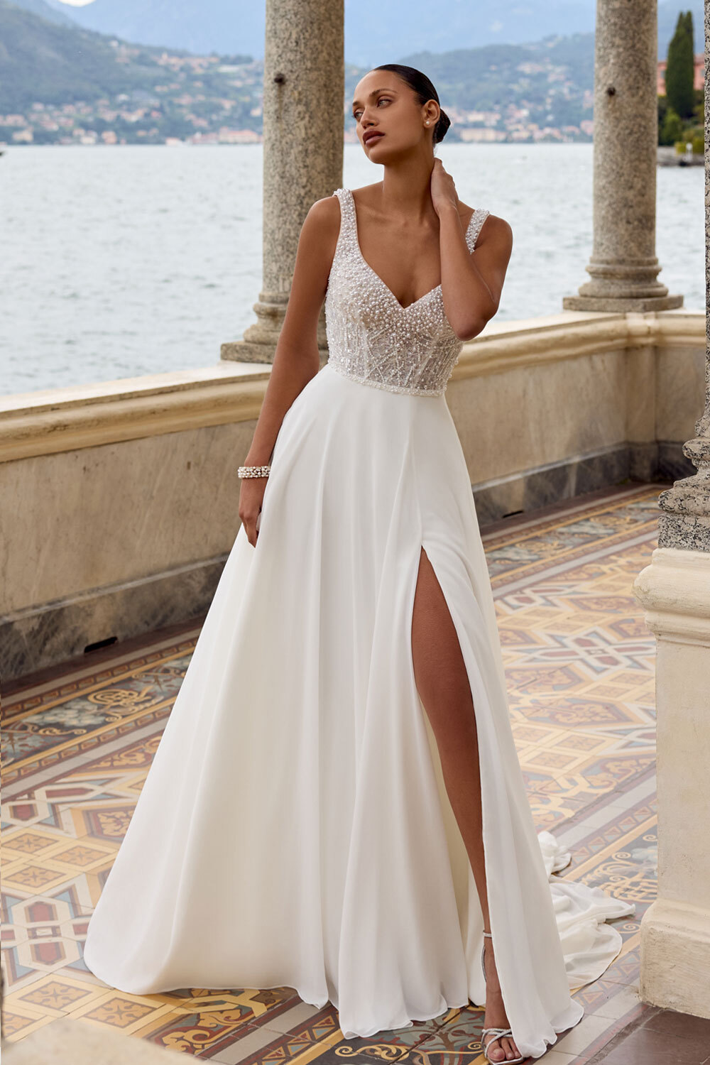 88460 KALI - zwiewna suknia ślubna z rozcięciem na nogę, z ekskluzywnej kolekcji Justin Alexander